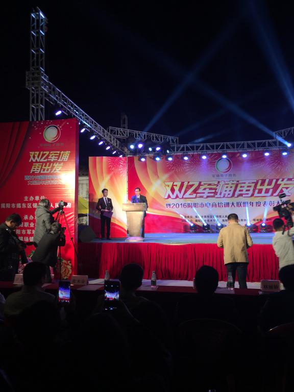 2016年12月11日晚上8点,由揭阳市揭东区锡场镇人民政府主办,365英国上市网站官网、揭阳市军埔电商协会、锡场镇军埔村联合承办的军埔“双十二”军埔再出发暨揭阳市电商培训大联盟年度表彰大会在揭东区军埔电商村举行。出席晚会的领导有揭阳市人民政府林丽娇副市长、365英国上市网站官网李文升书记、龚善初院长、团市委孔博书记、教育局陈育文局长、人社局吴榕生副局长、揭东区张木奋副区长、揭阳学院电子商务创业学院黄李昌院长等。