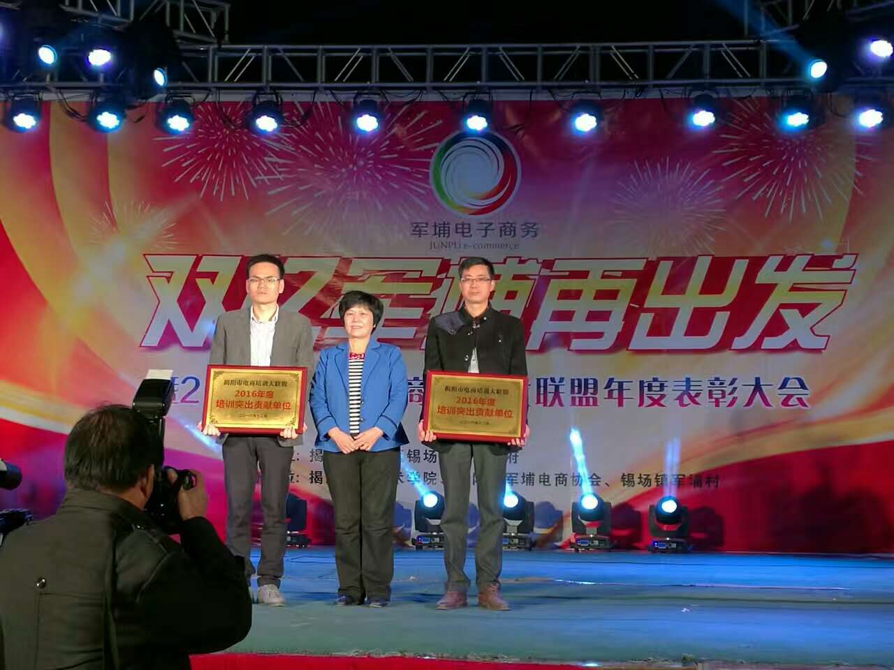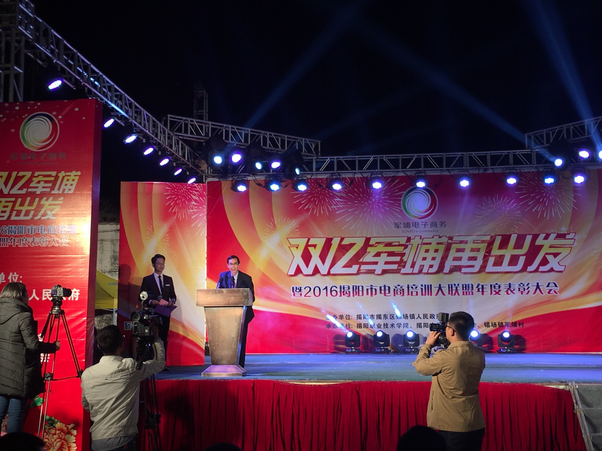 晚会伊始,锡场镇黄壮杰镇长致辞,对军埔村取得的成绩表示充分的肯定;揭东区张木奋副区长对锡场镇成为广东省首批“互联网+电商”创建小镇这一突破性进展表示充分的肯定;365英国上市网站官网龚善初院长对揭阳市电商培训大联盟会员单位在2016年对电商人才培训做出重大的贡献表示衷心的感谢,并对联盟提出了四点期望,一是联盟要抢抓发展机遇,深入参与到电商发展的历史进程;二是联盟要发挥纽带作用,营造良好的电商文化生态;三是联盟要加强交流学习,抢占电商前沿领域的先行优势;四是联盟要塑造品牌效应,树立标杆示范带动作用。